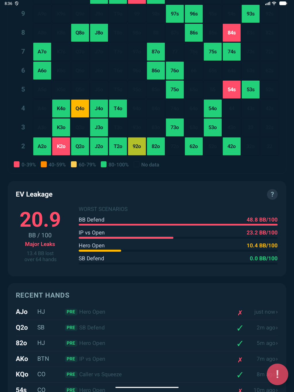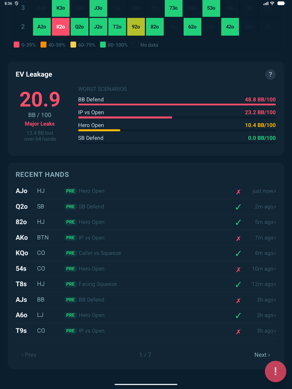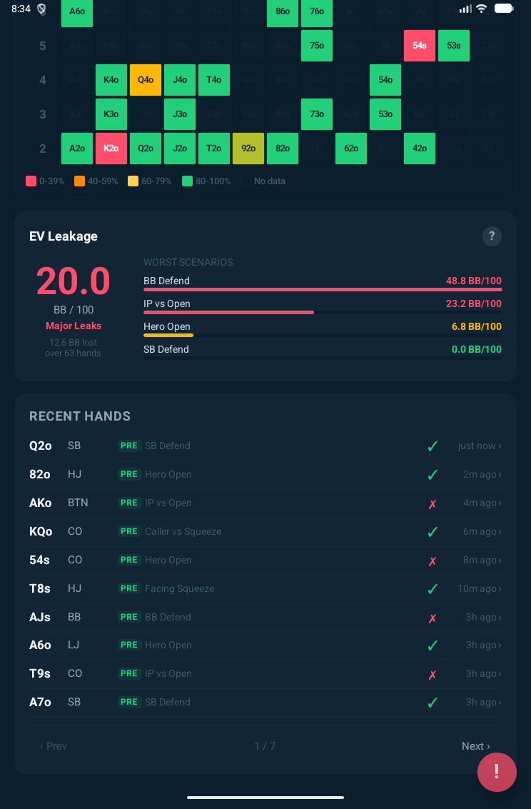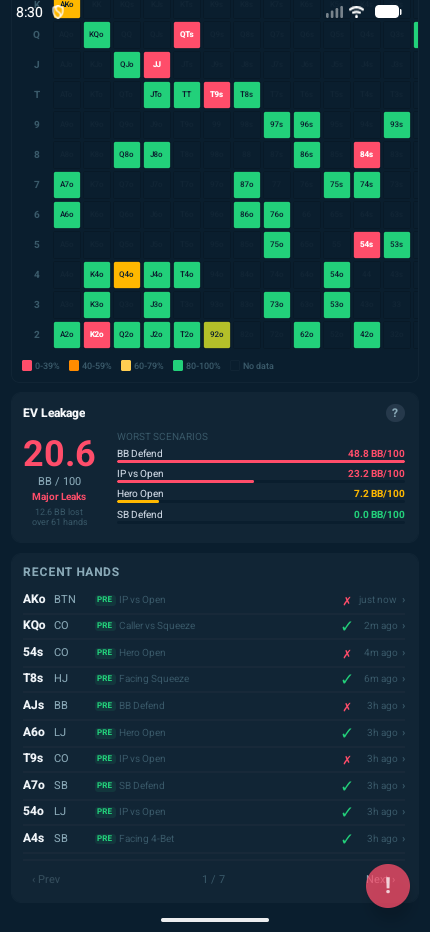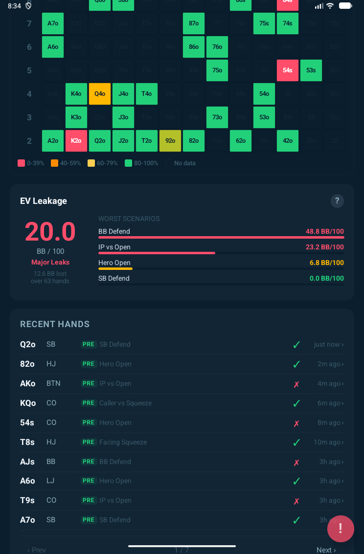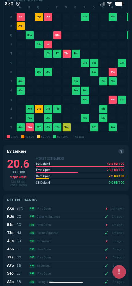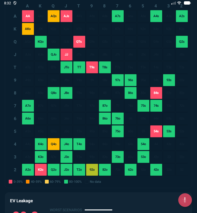 EV value text "-0.44bb" clipped to "-0.44..." on narrow bars