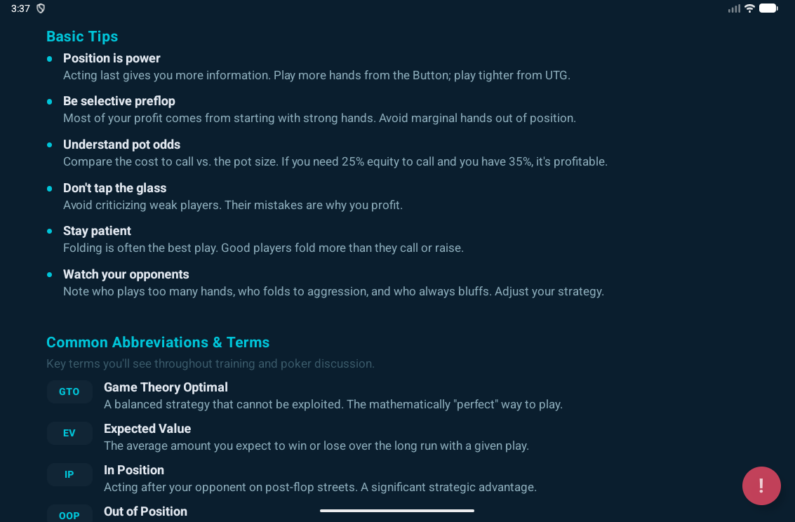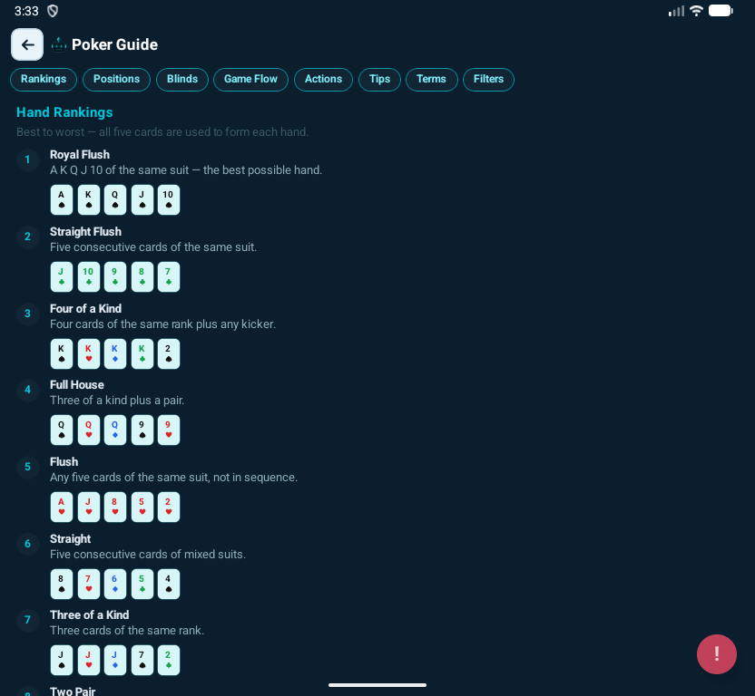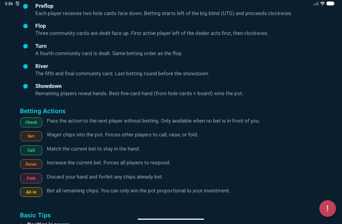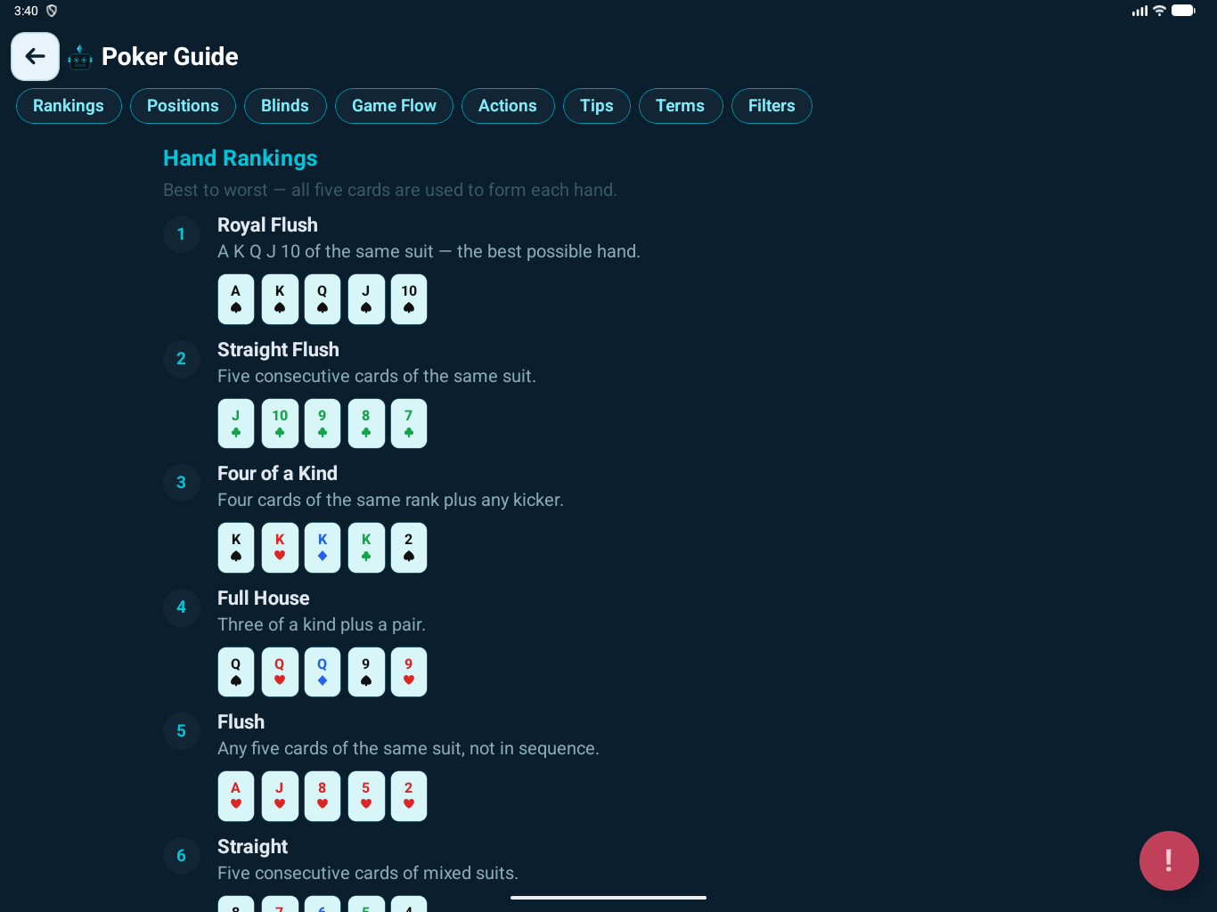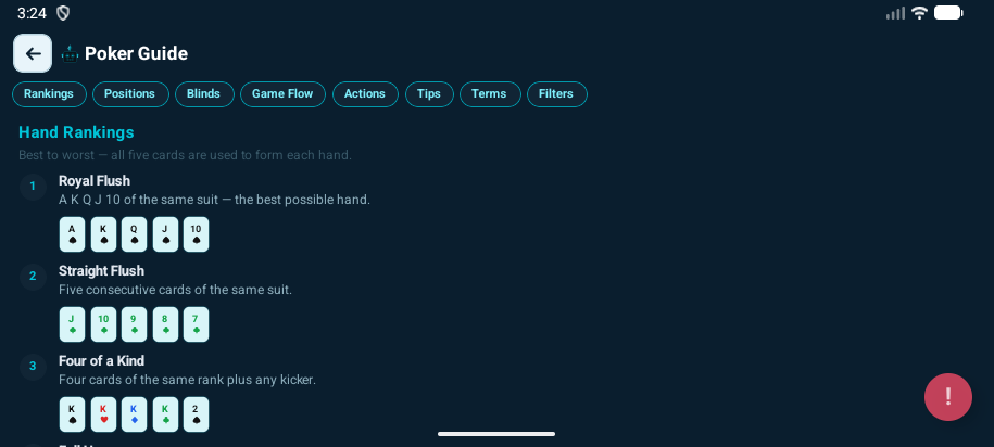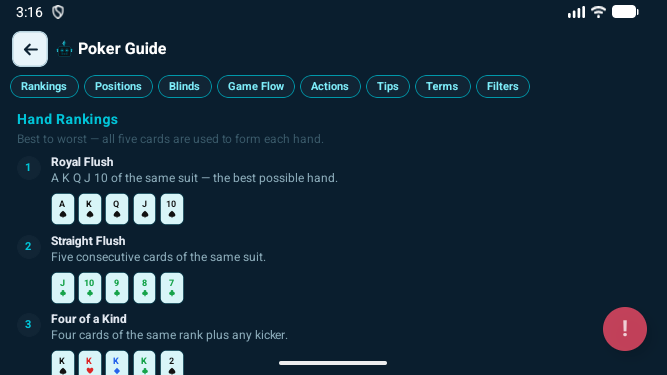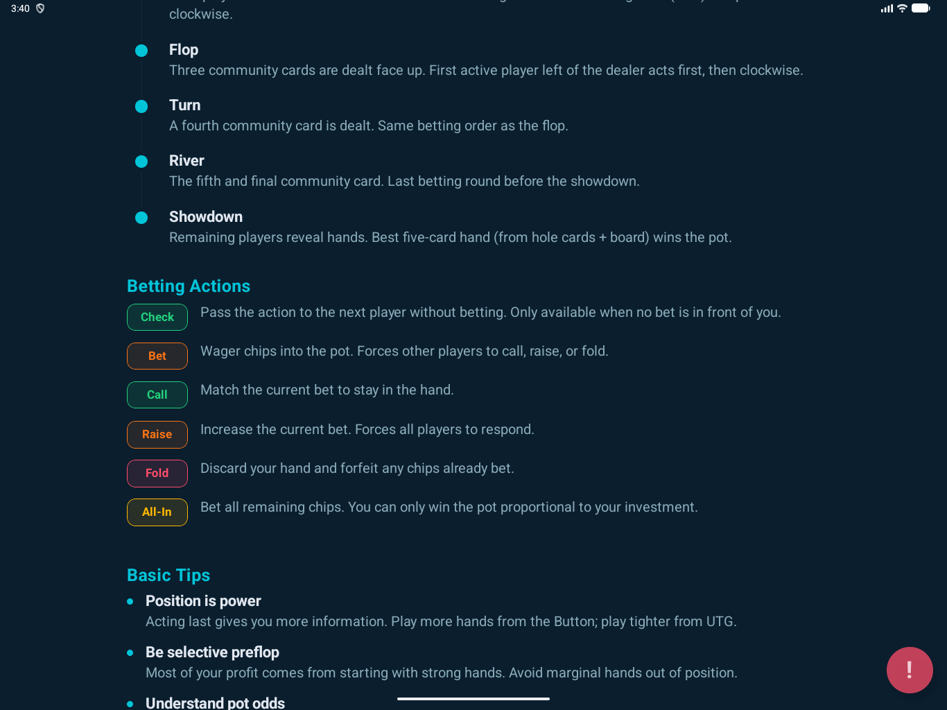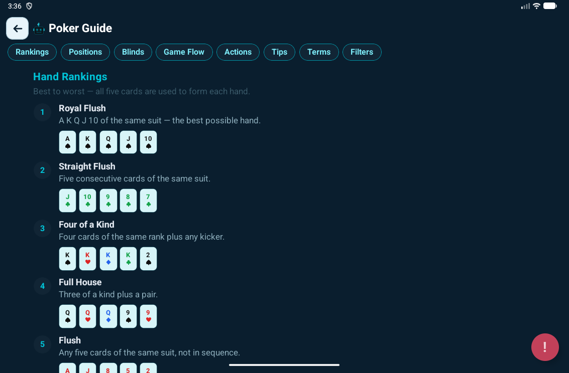 Poker Guide tablet landscape — content left-aligned, empty right — affected: