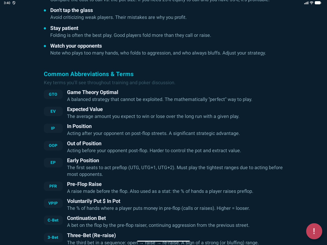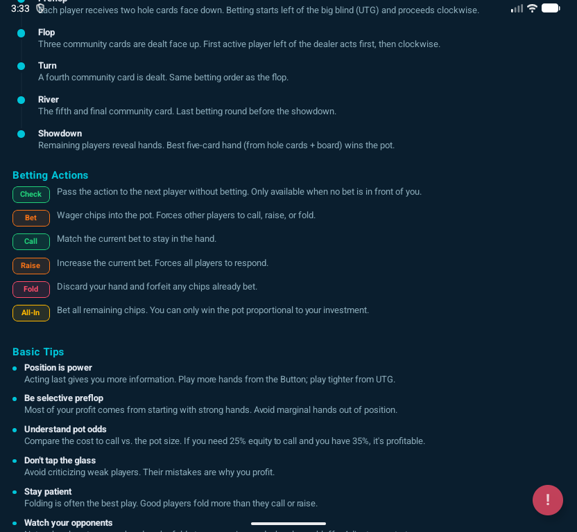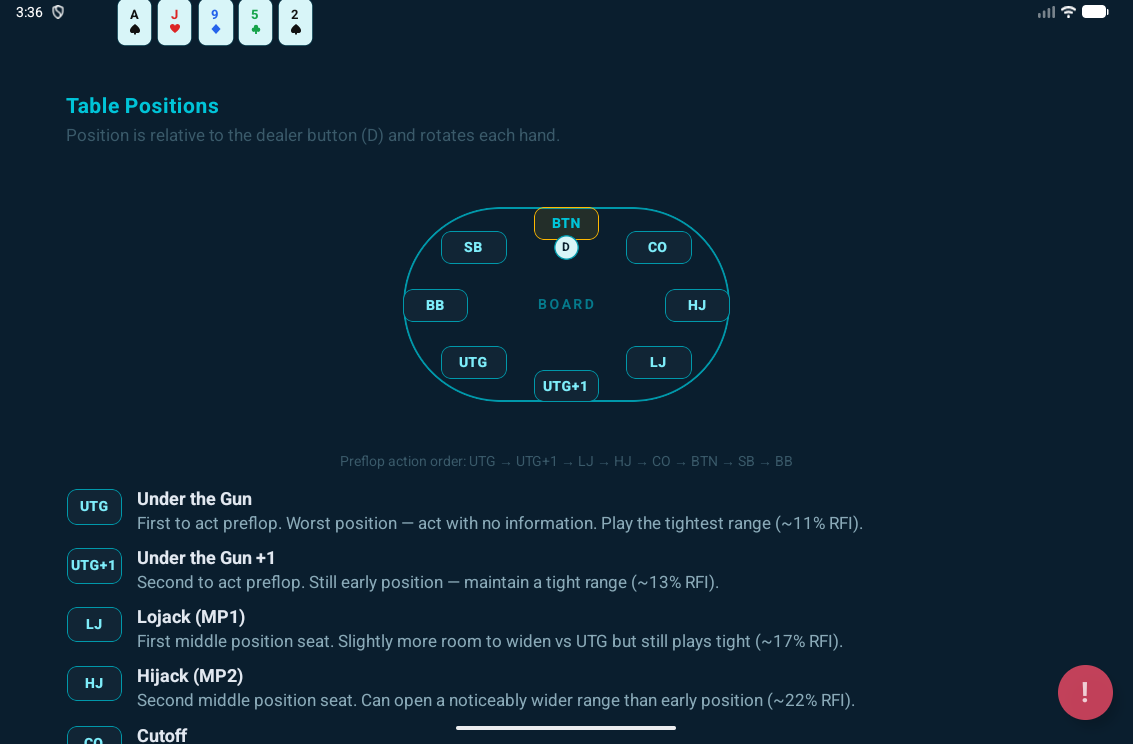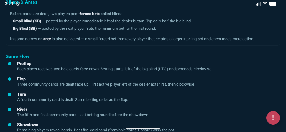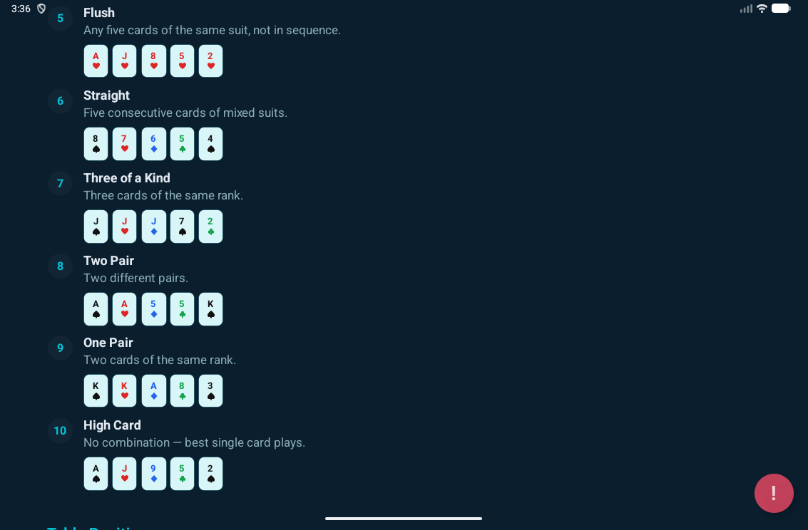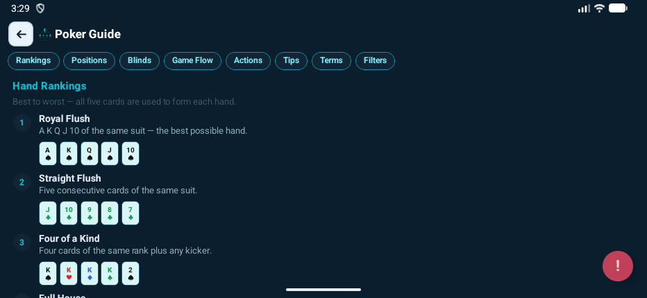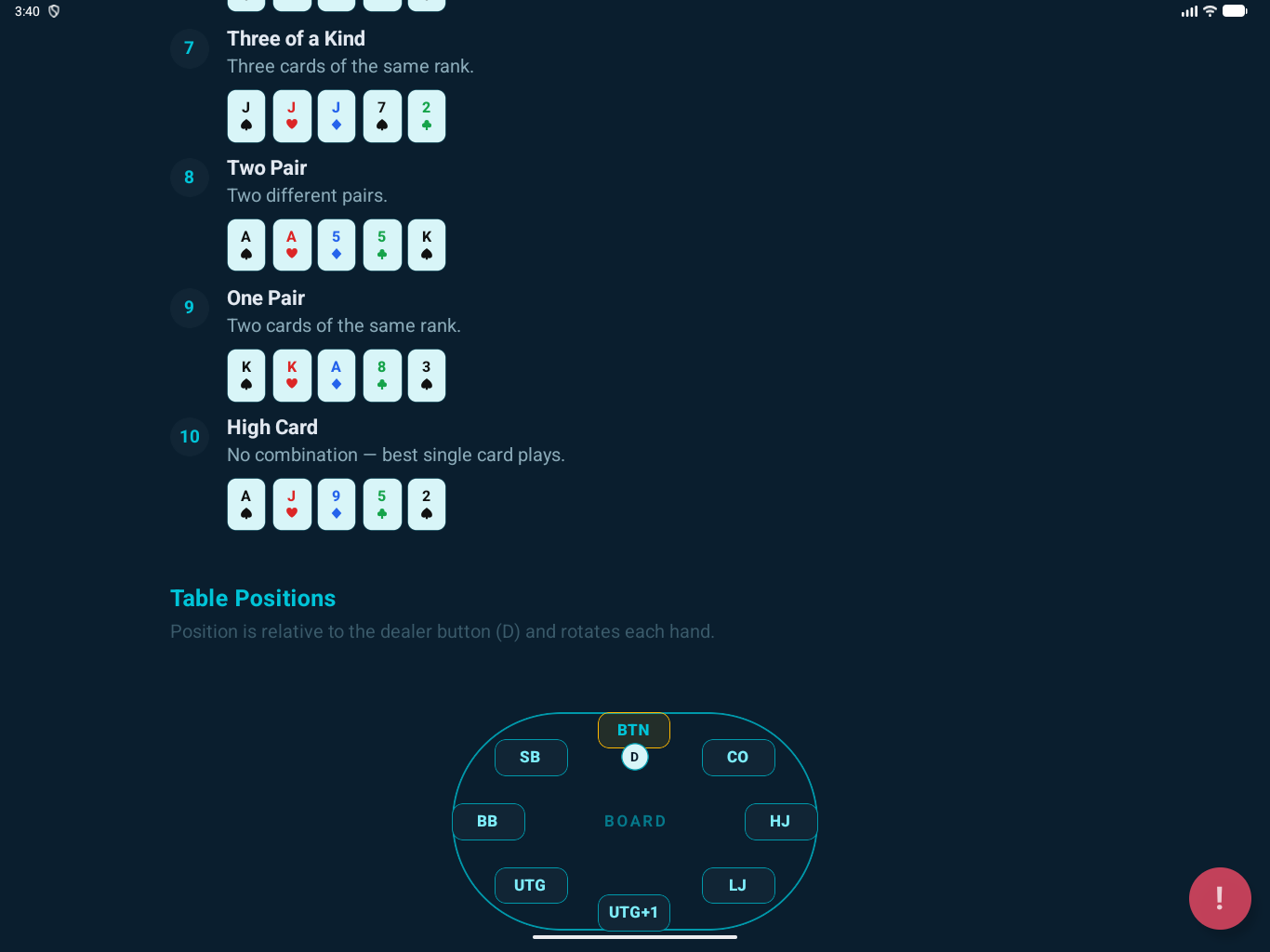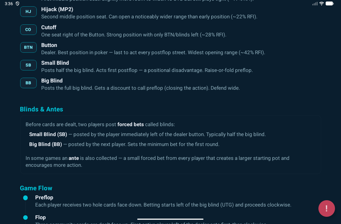Poker Guide tablet landscape — content left-aligned, empty right — affected: